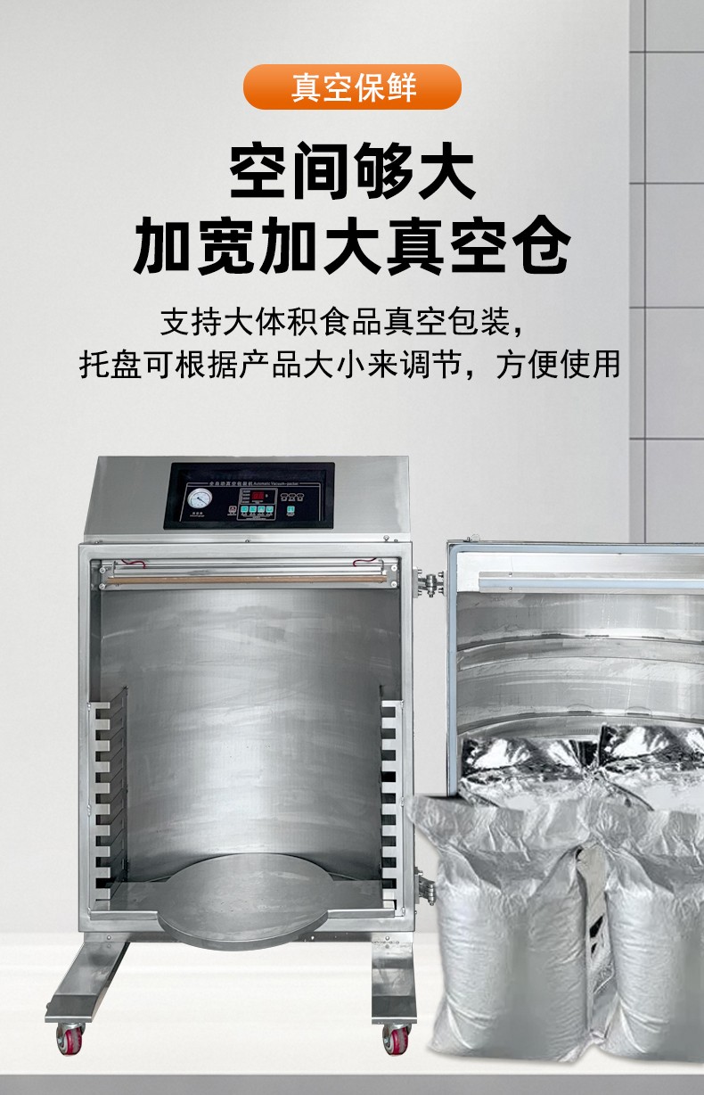 - 大容量真空室:立柜式真空包裝機的真空室容積較大,如 DZ-650L 型號,其熱封有效尺寸可達(dá) 650×8mm,可同時處理大批量食材或大尺寸包裝,能滿足整只火腿、海鮮禮盒、大桶粉末顆粒等特殊形狀物品的封裝需求49。